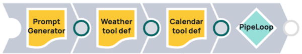 Agent pipeline with Agent SnapIn this example, we have an Agent with 2 tools: a weather tool and a calendar tool. We first start with a prompt generator to format the user input. Then define the tools the Agent can access.