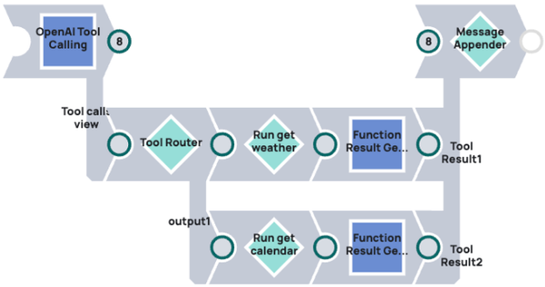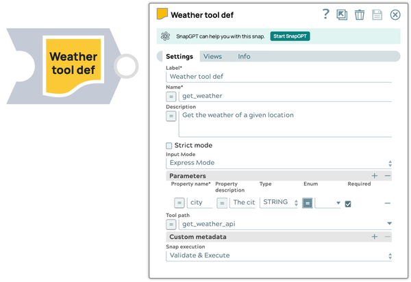 Previously, in an Agent Worker pipeline, the Tool Calling Snap is connected to Pipeline Execute Snaps to carry out tool calls, but this is no longer the case with the Agent Snap. Instead, a function definition should include the path of the pipeline to carry out the execution if this tool is called. This way, we can ensure every tool call can be performed successfully. If the user does not provide a tool pipeline with the function definition, the Agent Snap will not proceed.