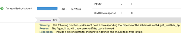 Agents can be long-running; it’s not rare to have an Agent run multiple iterations. To see what’s happening in the process, Agent Snap has built in monitoring during validation. The user will be able to see the iteration index, the tool that is currently being called, and the parameters that are used for the tool call in the pipeline statistics status bar.