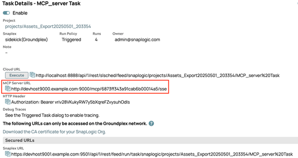 After the MCP server is successfully published, using the SnapLogic MCP server is no different from using other MCP servers running in SSE mode. It can be connected to by any MCP client that supports SSE mode; all you need is the MCP Server URL (and the Bearer Token if authentication is enabled during server registration).