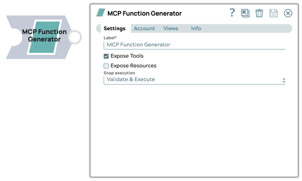MCP Function Generator SnapThe MCP Function Generator Snap enables users to retrieve the list of tools as SnapLogic function definitions to be used in a Tool Calling Snap.