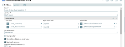 Basically, you need the same join criteria on each input view. In your case, you can add a Mapper in the top path to add a null-valued $ad_department, and another Mapper on the bottom path to create a null-valued $ad_company.
