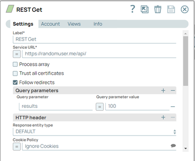 https://randomuser.me/api/?results=100I recommend you use a JSON Splitter to pull individual records out of the returned results array, then a Filter snap to reduce the data to your desired results. If you want to transform the records from there, use the Mapper snap.