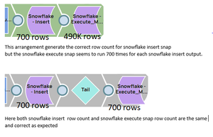 In the second example, you are using the Tail snap, which by definition: ..."reads the specified number of documents from the end of the input stream." In other words, if you have 700 documents in and set the "Number of documents" in the Tail snap to 1 (default), it returns only the last record. This is a great way to wait for all upstream documents to be delivered before continuing to the next step... in your case, the Snowflake Execute snap.