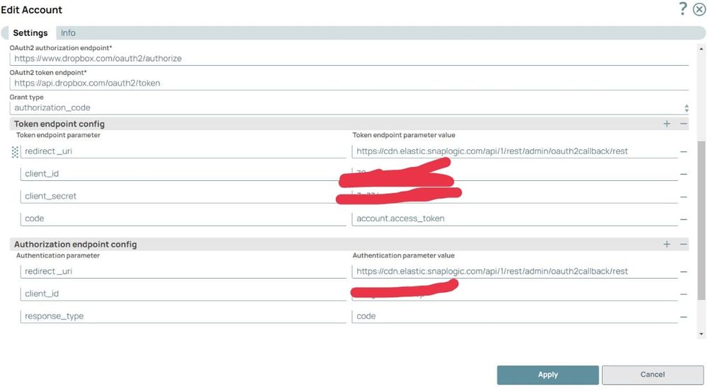 {"http_status_code": 500, "response_map": {"error_list": [{"message": "Request to token endpoint https://api.dropboxapi.com/oauth2/token failed for account \"/ConnectFasterInc/Demo_SnapDev_Solutions_Project/Md/DropboxAcc\" of type \"REST OAuth2 Account\""}]}}I give proper client id and I use this redirect Uri